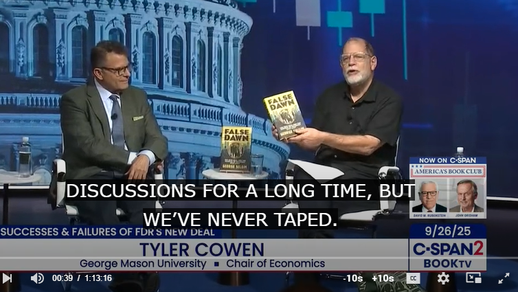 In September 2025, the Cato Institute with Tyler Cowen hosted an interview with economist George Selgin about his book False Dawn: The New Deal and the Promise of Recovery, 1933-1947.