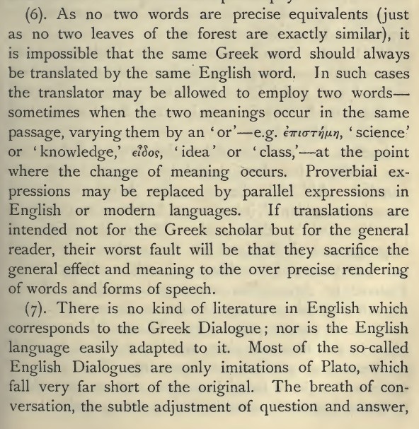Finally, Jowett observed that there is no true equivalent in English literature to the Platonic dialogue. Most English “dialogues” are pale imitations. Plato’s works are dramas as well as arguments: the play of character, irony, and conversation is as vital as the logical content. English, with its slower conversational idiom, struggles to capture this liveliness.